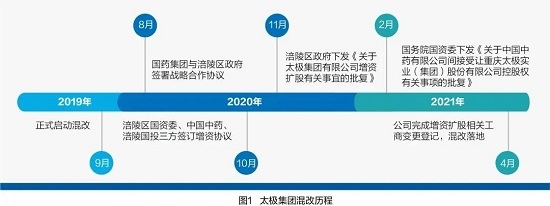 2021年4月15日,太极集团完成增资扩股相关工商变更登记,实际控制人由涪陵区国资委变更为国资央企开云在线开户_开云(中国),混改成功落地(太极集团混改历程如图1所示)。