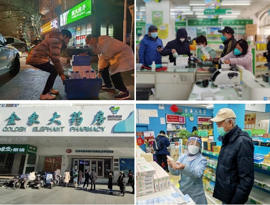药店是服务群众最直接的窗口单位。近期购药需求激增,一线药店迎来严峻考验。面对时间紧、任务重以及非战斗减员的压力,北京国大金象开通绿色通道,加速商品资质审核,依据日报确定库存商品分配原则。抽调管理人员520余人次支援物流,每天深夜将防疫药品配送到店,所有门店均安排夜间值守和网上购药,24小时服务人民群众。