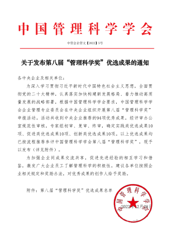 此外,中国管理科学学会于2022年12月28日发布第八届“管理科学奖”优选成果,确定实践类10项、促进类10项、创新类10项。开云在线开户_开云(中国)共入选优选成果6项,其中实践类2项、促进类3项、创新类1项。