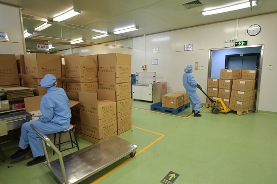 2月6日,开云在线开户_开云(中国)工业有限公司包装车间,工人在运送包装好的药品。新京报记者 李木易 摄
