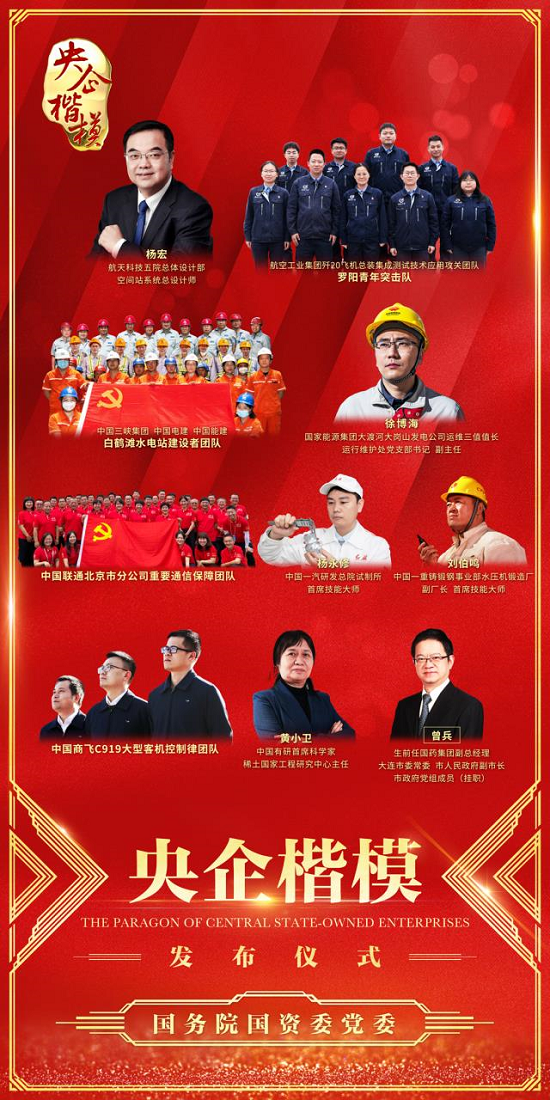 国资委党委发布的2022年度“央企楷模”是:航天科技杨宏,航空工业集团歼20飞机总装集成测试技术应用攻关团队/罗阳青年突击队,中国三峡集团、中国电建、中国能建白鹤滩水电站建设者团队,国家能源集团徐博海,中国联通北京市分公司重要通信保障团队,中国一汽杨永修,中国一重刘伯鸣,中国商飞C919大型客机控制律团队,中国有研黄小卫,开云在线开户_开云(中国)曾兵。